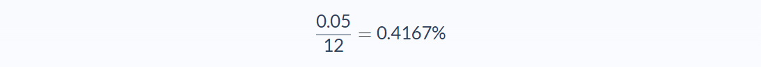 To start we first need to work out what is the interest that will be charged for loaning the money for one month. Our interest rate is 5% and there are 12 months in a year, we need to divide the 5% by the 12 months of the year to get the interest per month.