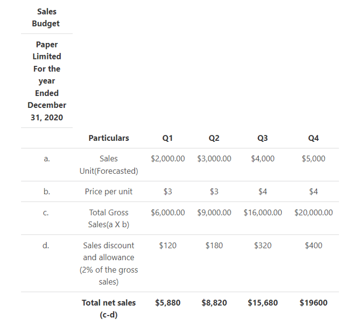 On analysis of the competition and market conditions, the sales discount and allowance percentage of the company is kept at 2% of the gross sales in the budgeted period. Following will be the updated sales budget of Paper Limited for the year ended on December 31, 2020