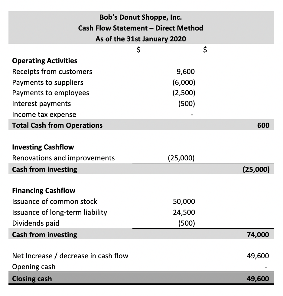 We have already seen Bob’s Donut Shoppe cash flow statement prepared under an indirect method. Let’s see how the cash flow statement prepared through the direct method would look: