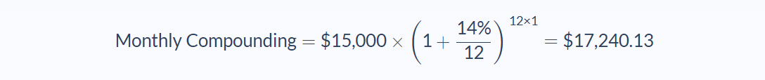 One example of continuous compounding in action is an account that earns interest at a rate of 14% per year, compounded monthly. The balance continually earns interest, which is added to the balance, and because there are 12 months in a year, the account balance increases by 1.17% each month. Over time, this leads to a significantly larger balance.