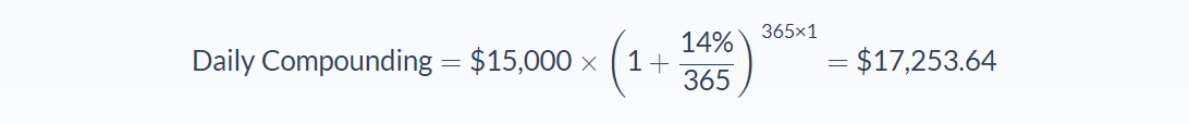 Jeremy is looking at investment opportunities and has $15,000 to invest, with an expected interest of 14% over the next year. We can use the finite and continuous compounding formulas above to find the ending value of the investment: