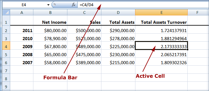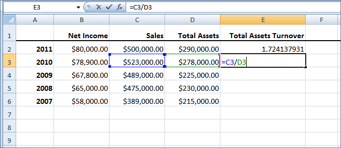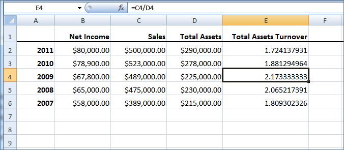 In our illustration above, to determine Total Assets Turnover for each year, we would continue entering formulas into each cell in column E referencing the cells for Sales divided by Total Assets for each year.