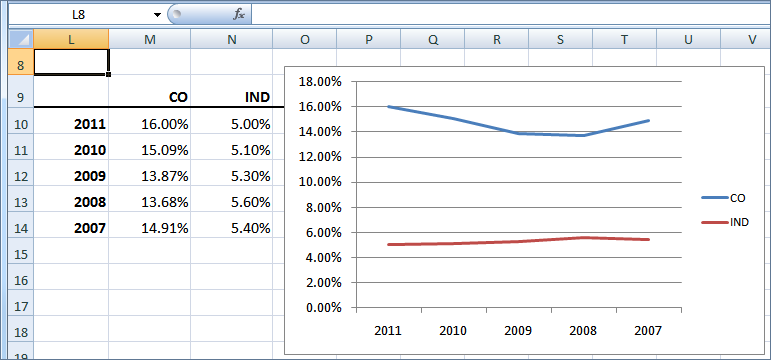 - Using the illustration as your source, type the numbers and headings into a blank worksheet starting at cell L9. You will only type the data included in the range of cells starting at L9 on the top left to N14 on the bottom right or data range L9:N14. The chart to the right is what we’re about to create. Try formatting the data as shown to practice what has already discussed, and remember to input “plain” numbers and format using Excel’s formatting tools. (TIP: 16 = 1600%, .16 = 16%)