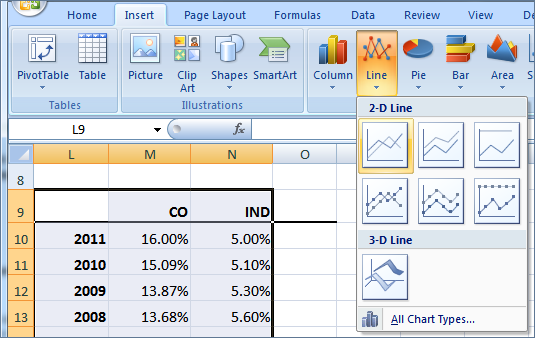 - With the cell range highlighted, click the Insert tab on the Ribbon at the top of the Excel screen, and in the Charts group click Line. You will notice an option box appear presenting various line chart style options. Select the top left 2-D Line style. When you click this option, the line chart is inserted onto the worksheet.