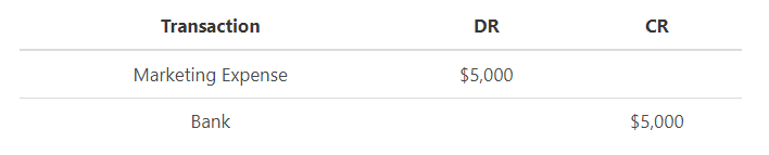Company A incurs a marketing expense of $5,000. The amount is paid through cheque.
