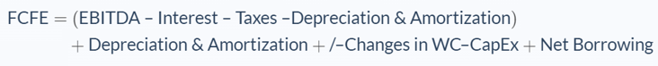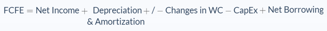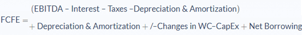 The formula for FCFE is: FCFE = Cash from Operations − Capital Expenditure (Capex) + Net Borrowing
