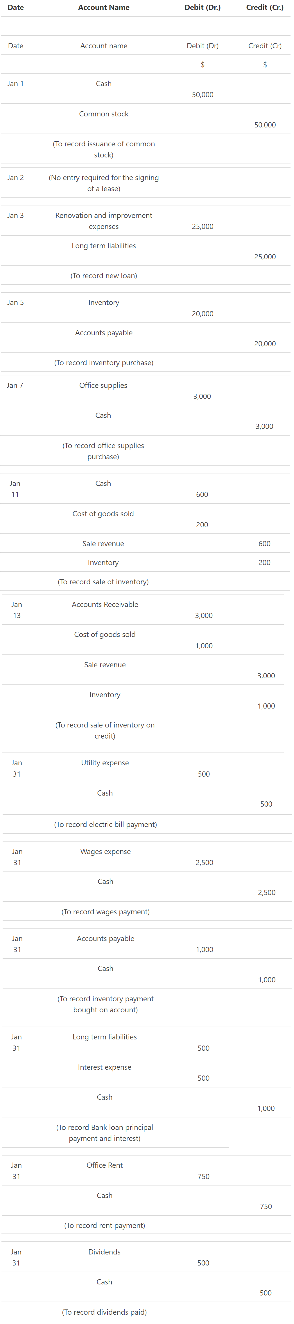 Jan 31. Bob's first payment for the bank loan is also now due. In addition to the $ 1000 loan repayment, Interest on the loan is $500.