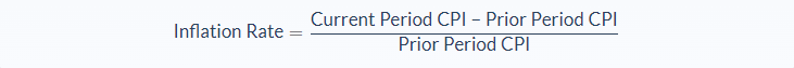 Inflation Rate = Current Period CPI−Prior Period CPI / Prior Period CPI