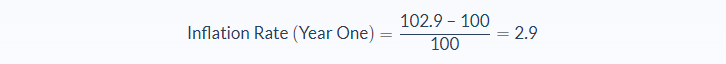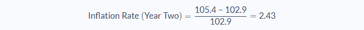 Then, by calculating the change in the price index, Sarah calculates the inflation rate for year 1 and for year 2. In year 1, 2.9% is the inflation rate and in year 2 is 2.43%.