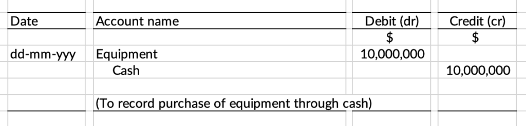 As per the earlier mentioned rules of the debit and credit system, any increase in assets (equipment) is recorded as a debit entry and any decrease in an asset (cash) is recorded as a credit entry. Both entries will affect the accounting equation as the purchase of equipment would increase the assets side and the payment in cash would decrease the asset side.
