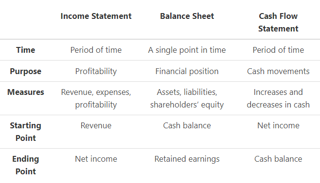 The table below might be helpful in remembering what each financial statement is used for and why: