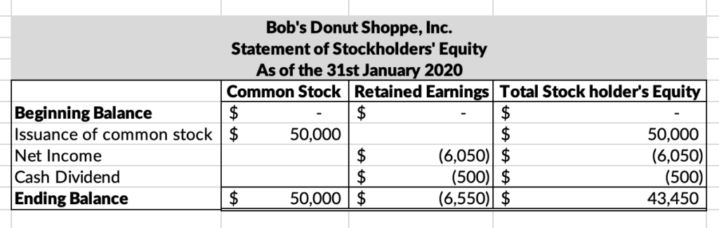 We have already seen the presentation of the balance sheet for Bob and his donut shop. Here, we can see what his stockholder’s equity statement looks like: