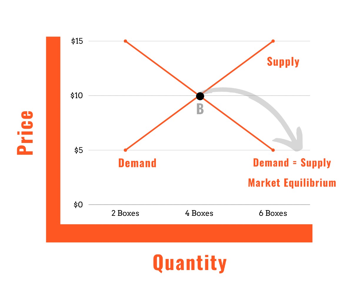 Analyzing demand and supply together, we see a point of intersection between both the graphs. We can spot this at point B, where the quantity of boxes is 4 while the price of each box is $10. This point shows the perfect point of sales. At this point, the demand of customers is exactly equal to the supply of berry boxes. This is the point of Market Equilibrium.