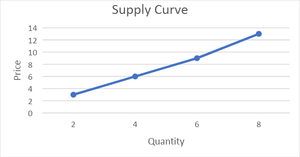 - A supply curve moves upwards from left to right, as per the law of supply. That is, as the price of given good increases the quantity supplied also increases