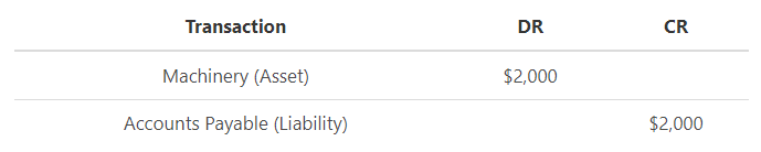As machinery is bought on credit, liability will increase by $2,000, while machinery or asset will increase by $2,000.