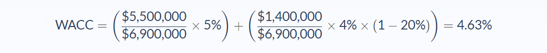 Using this example, one can determine that the company has a WACC of 4.63%, which is the amount of money the company needs to pay investors for each $1 of funding. In this case, it amounts to $.0463 per $1.